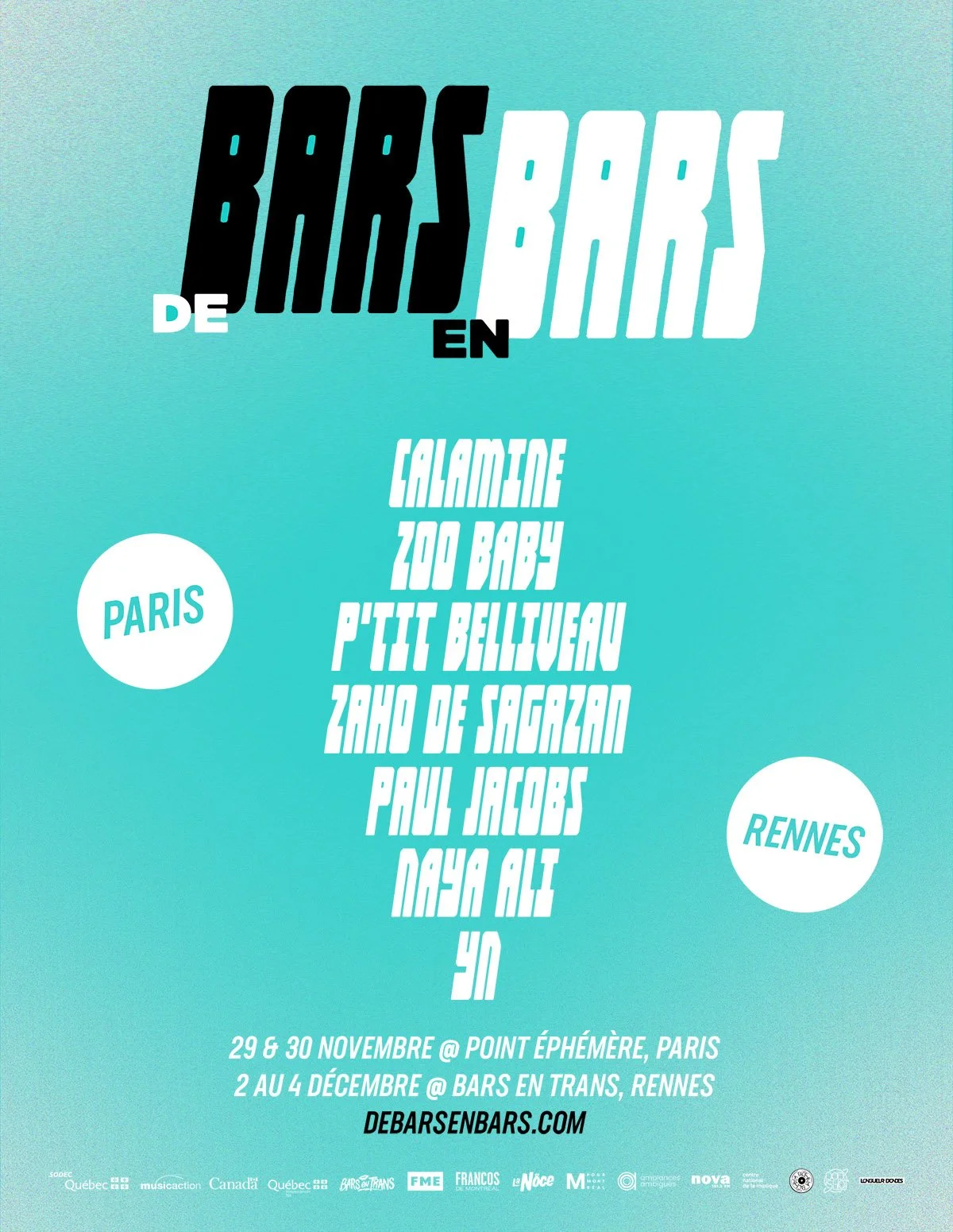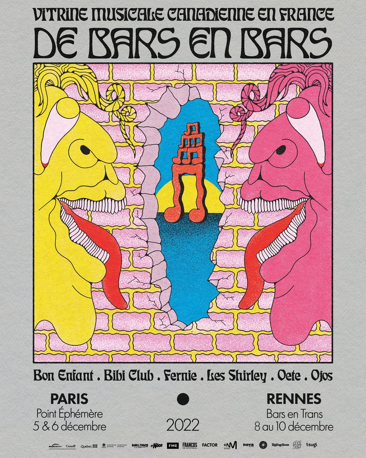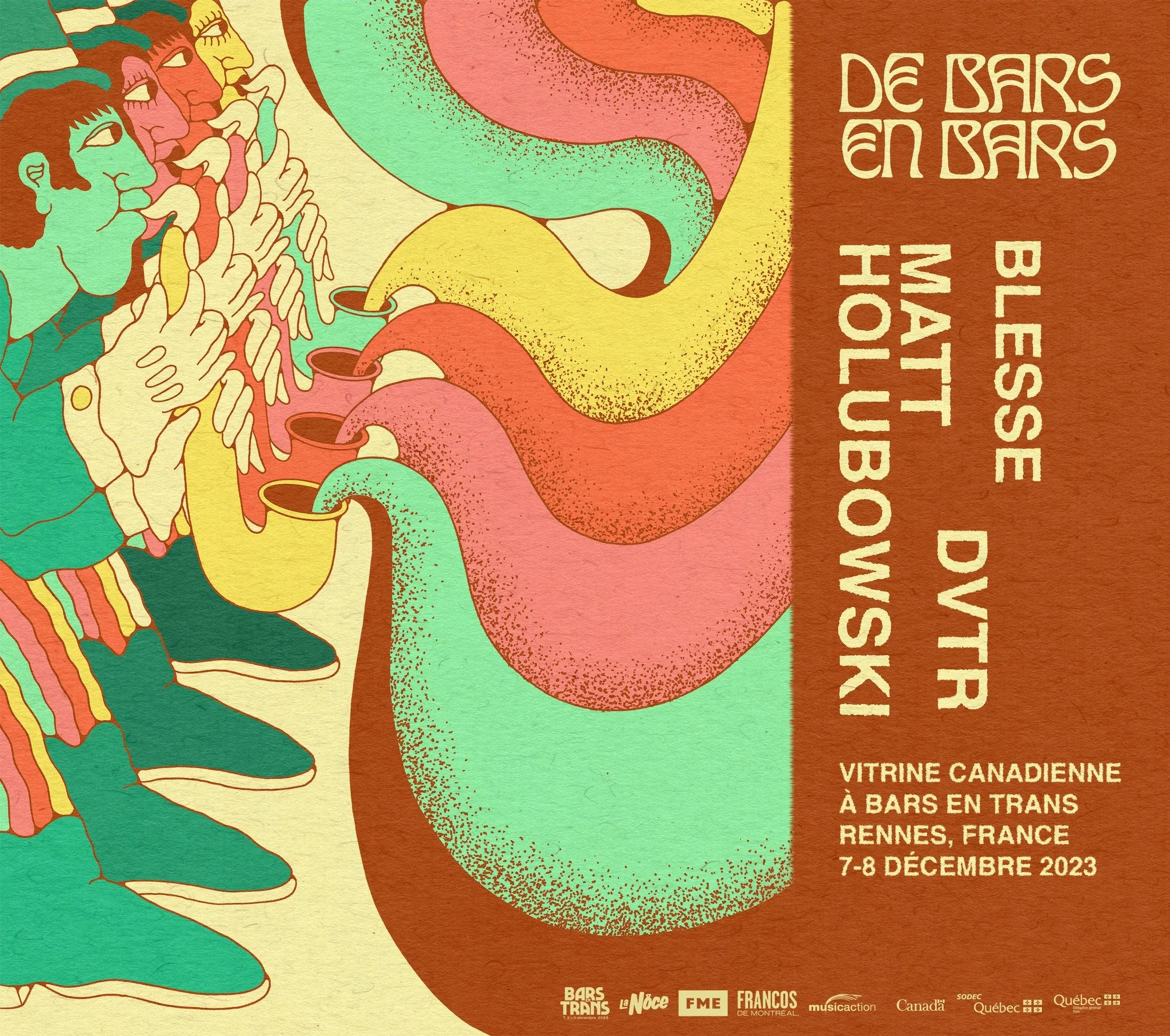La vitrine musicale canadienne De Bars en Bars, menée conjointement par La Noce, les Francos de Montréal et le FME, en collaboration avec les Bars en Trans en France, est de retour pour une 5e édition!